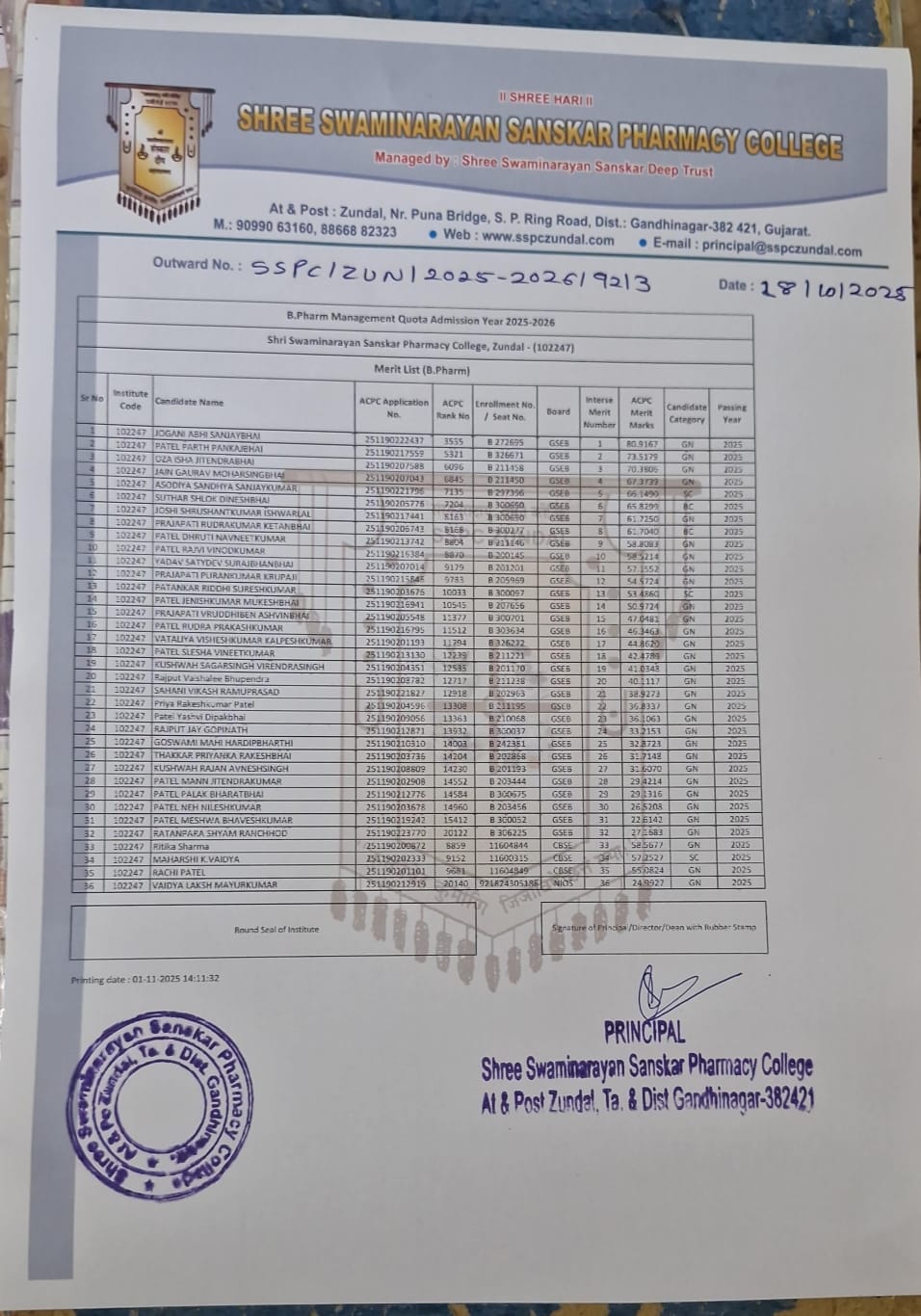 • SHREE SWAMINARAYAN SANSKAR PHARMACY COLLEGE ZUNDAL