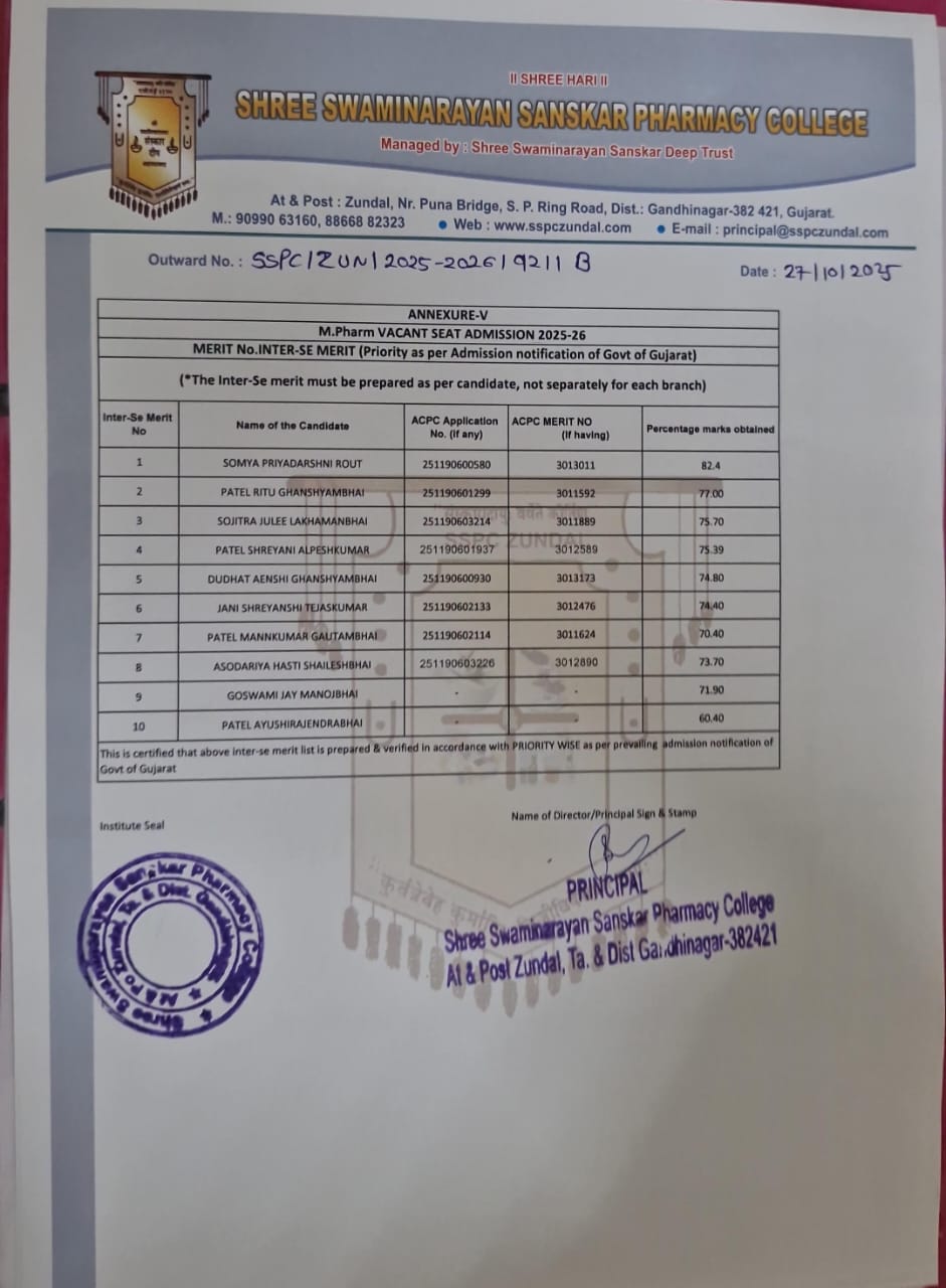 • SHREE SWAMINARAYAN SANSKAR PHARMACY COLLEGE ZUNDAL